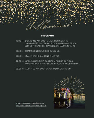 Boarding ab 18:00 Uhr, Fahrt entlang der Mainufer vor der Skyline, 4 Gänge- Dinner mit Getränken (am Ufer festliegend), Beste Sicht auf das Feuerwerks ohne Gedränge. Ende der Veranstaltung ca. 23:00 Uhr.