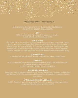 Optimal können Sie auch unsere exklusive Bootsfahrt zum Museumsuferfest buchen (siehe optionales Tagesprogramm):